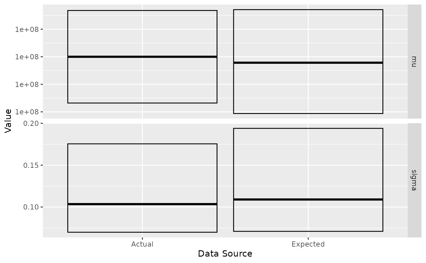 nist_result <- generate(nist_sampler, show_progress = FALSE)We rely on the posterior R package to examine the posterior distribution by summarising each variable by its quantiles. To better visualise the correspondence between the expected and actual values, we can plot their respective IQRs.