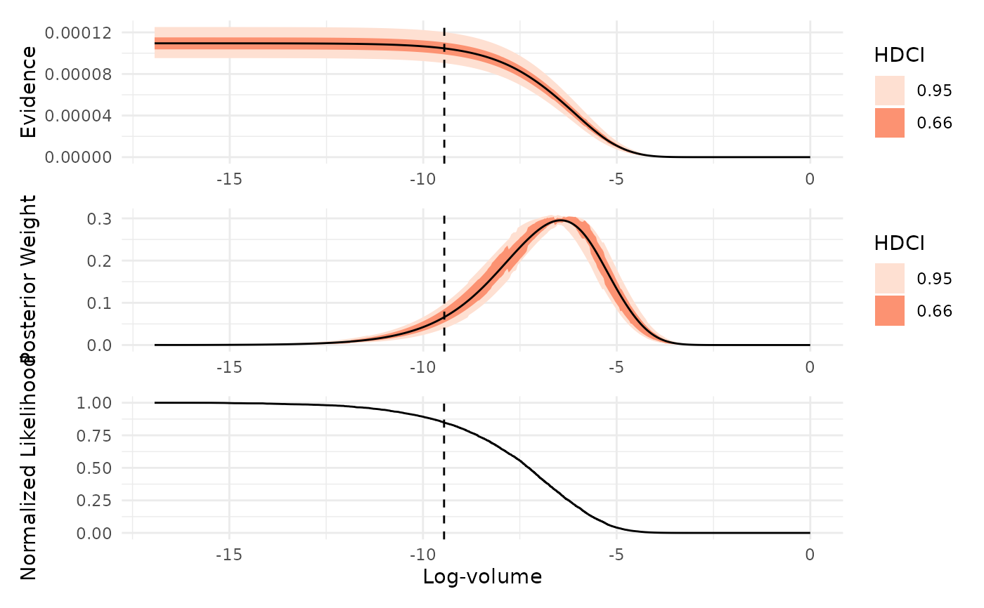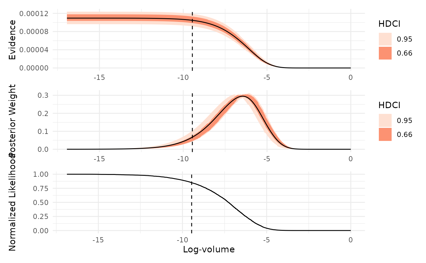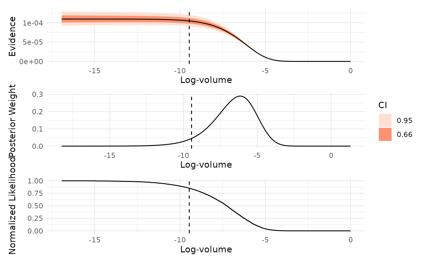 which = "evidence": Plots the estimated marginal likelihood (evidence) as a function of log-prior volume, with uncertainty intervals. Peaks in this plot indicate regions of prior volume that contribute most to the evidence estimate.which = "weight": Shows the distribution of posterior mass across log-prior volume. This plot highlights which regions of the prior volume contain the most posterior probability, helping to identify where the sampler concentrated its effort.which = "likelihood": Displays the normalized likelihood as a function of log-prior volume. Smoothness in this plot indicates effective likelihood-restricted prior sampling, while irregularities may suggest sampling difficulties or, in some cases, misspecified likelihood functions.